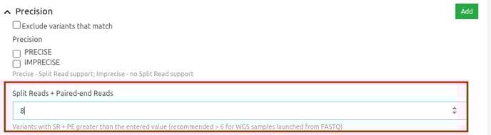 The Precision dynamic filter also incorporates the sum of Split Reads (SR) and Paired-end Reads (PE) support, allowing further customization.