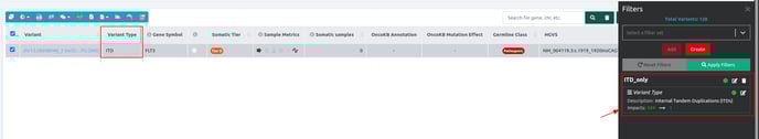 Additionally, dynamic filters can be applied to these types of variants in order to have them portrayed alone, independently if they come from ITDetect or our Sentieon caller. It is present as a check box during the Variant Type filtering scheme: