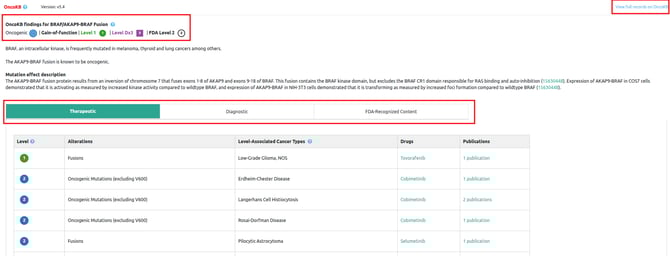 By clicking on the card, users can access the detailed OncoKB component, which mirrors the layout and content of the OncoKB website for the selected fusion.