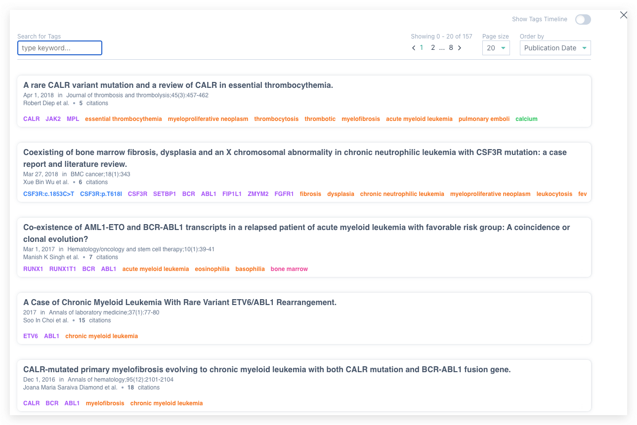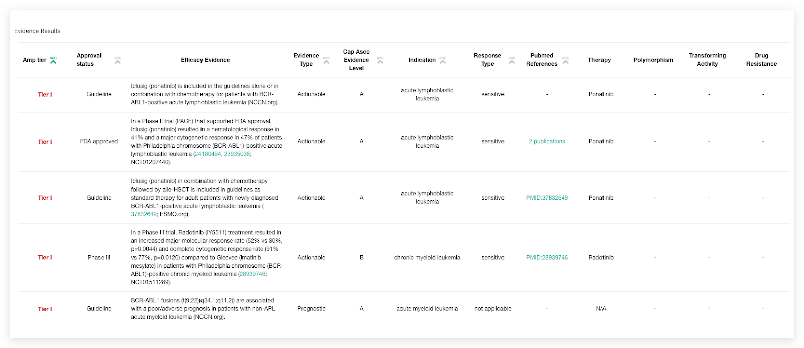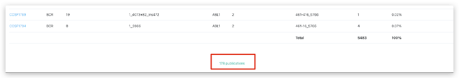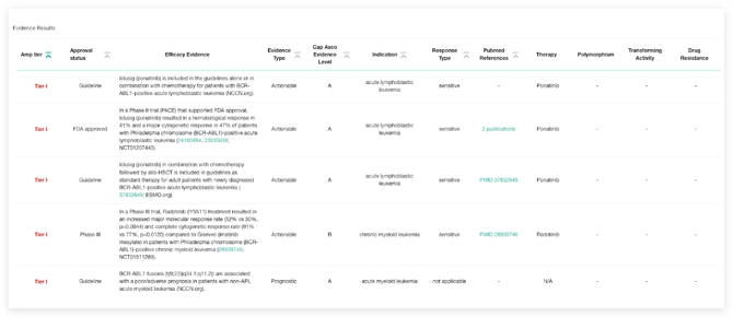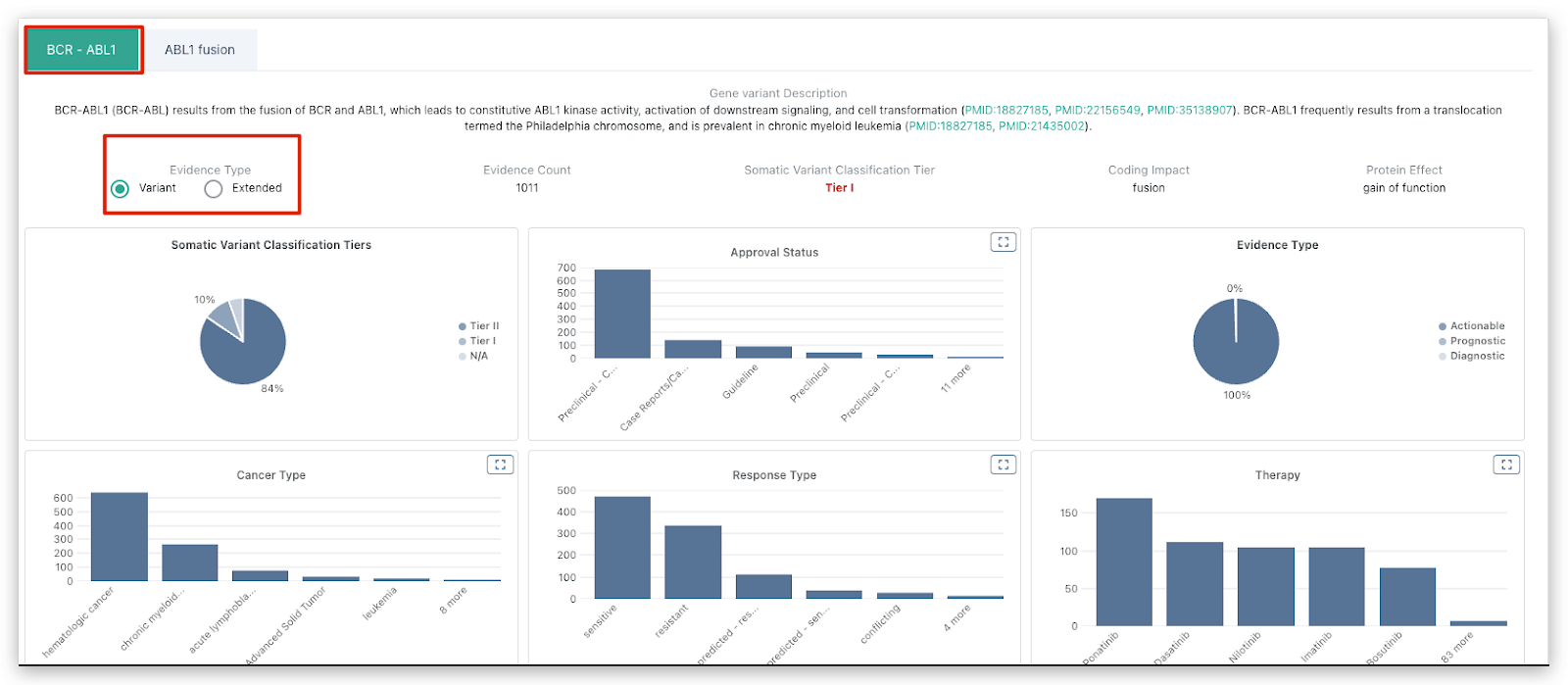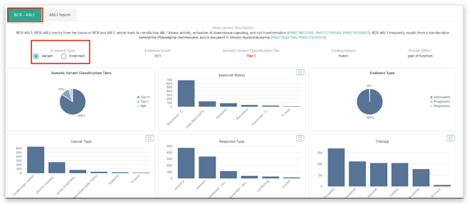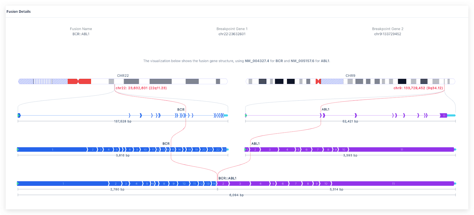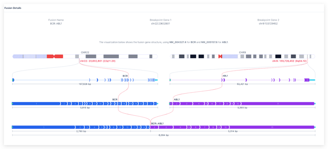Fusion annotations are displayed for the relevant fusion (e.g., BCR-ABL1),or whenever a gene is involved regardless of the fusion partner (ABL1 fusions).