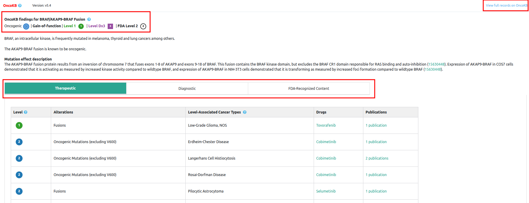 - OncoKB annotation: Displays the strength of clinical evidence linking the fusion to cancer diagnosis, prognosis, or therapeutic actionability.