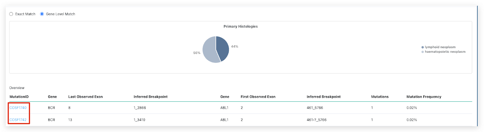 The Cosmic card contains the gene level match with the Primary histologies frequency based on the total number of tested samples. Below this graph, a table is displayed with the MutationIds in rows, and columns including i.e the gene partners, the mRNA breakpoint position in each gene (inferred breakpoint), number of mutations and mutation frequency observed for each mutationID.
