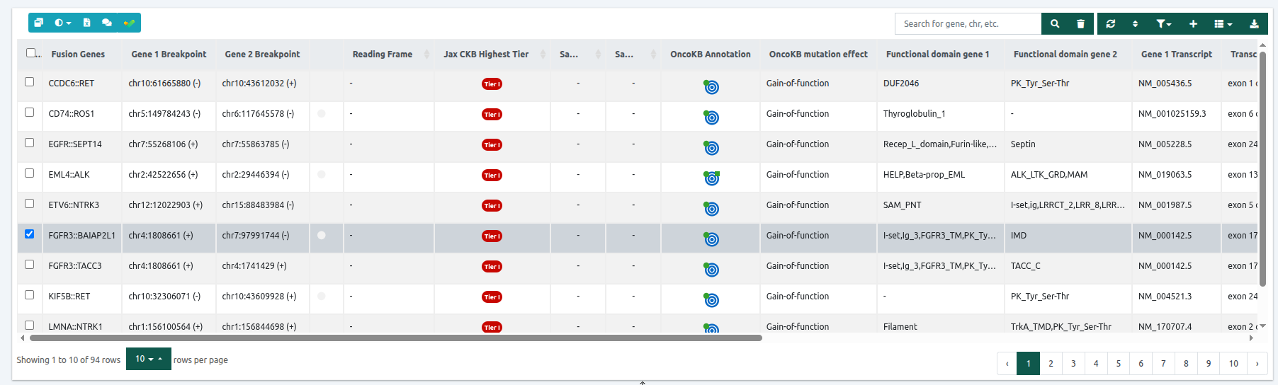 - Fusion genes: Displays the gene partners involved in the fusion (Gene 1 and Gene 2).