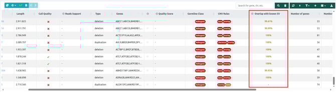 - For each SV, the column reports the highest available overlap percentage and enables interpretation based on the inferred pathogenicity derived from genomic overlap, including gene and exon-level overlap.