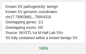 When hovering over an overlap percentage, users can review detailed information about the overlapping known SV, including whether the overlap is with a pathogenic, benign, or variant of uncertain significance (VUS) SV. The tooltip also displays the genomic coordinates of the known SV, the data source from which it is annotated, the extent of gene and exon overlap (full or partial), and the structural relationship between the variants (e.g., identical genomic coordinates or one SV contained within the other).