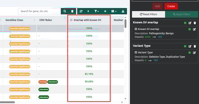 This section describes the information displayed in the “Overlap with Known SVs” column and explains how to filter results based on the predicted pathogenicity derived from the overlap percentage.