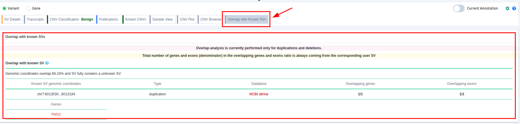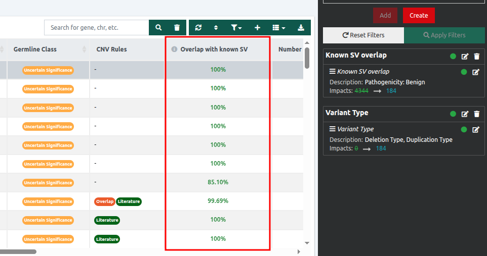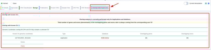 - The “Overlap with Known SVs” column provides an at-a-glance assessment of how a user’s SV overlaps with previously reported benign or pathogenic SVs of the same CNV type (deletions or duplications).