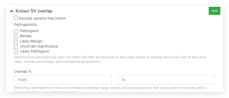 A filter is available to select SVs based on the predicted pathogenicity inferred from overlap with known SVs of the same class. Users can also define a custom range of overlap percentages to retain in the results.