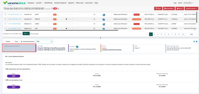Any somatic sample analyzed either with a WES sequencing assay or an Agilent SureSelect Cancer CGP panel will get a TMB classification. In the results page of an analysis, the TMB score is visible above the Variant Table: