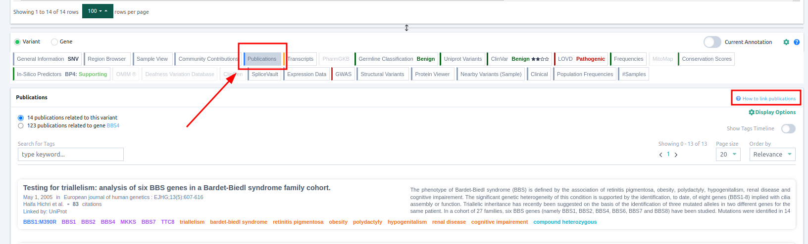 - Publications: publications from PubMed related to the selected variant or gene where genes, variants, diseases, phenotypes, chemical compounds, and drugs (if applicable) are tagged by our internal AI tool.