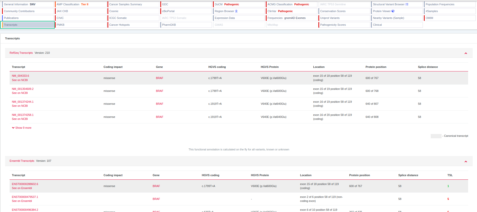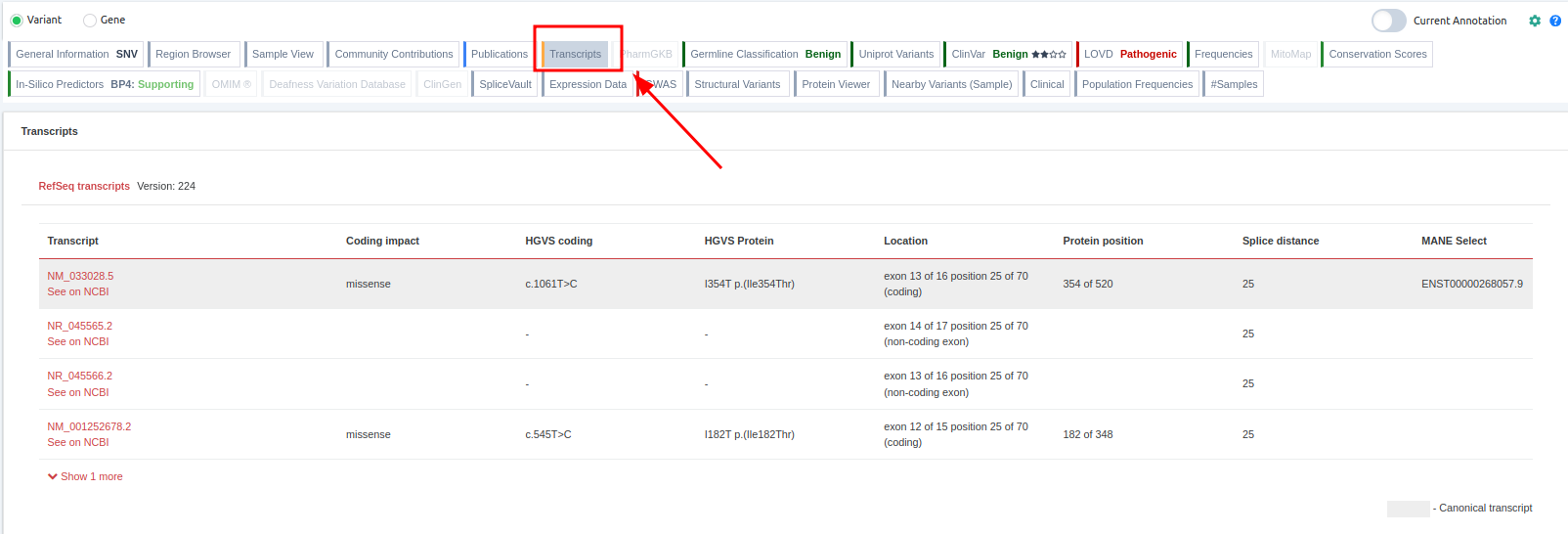 - Transcripts: Chromosomal location, link to UCSC genome browser, dbSNP (rs number), Refseq transcripts containing the variant, HGVS notation, etc. Available transcripts for the selected genes are displayed (information from RefSeq and Ensembl, along with the MANE transcript). The transcript used in classification is highlighted in the Transcripts summary card.