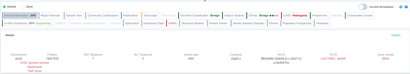 - ClinGen: Curated data from the ClinGen variants database. Information will be available when the queried variant has already been curated by any of the ClinGen expert panels.
