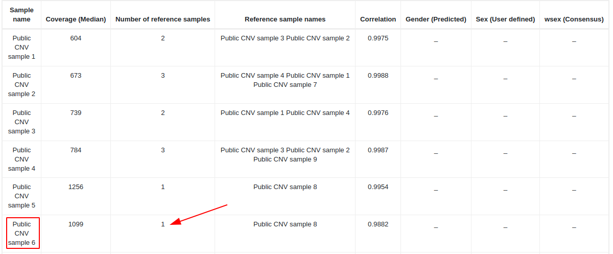 In the CNV QC report, the user can check how many samples were used to construct the reference set for each test sample and their correlation coefficient. A high number of samples (at least 2) used for the reference set and a high correlation coefficient (> 0.97 for gene panels and > 0.98 for exomes) would be indicative of a good performance and a higher reliability of the CNVs found in that test sample. If the coefficient of correlation is too low for a test sample, the algorithm won’t be able to generate meaningful results, and no CNVs will be called in that test sample.