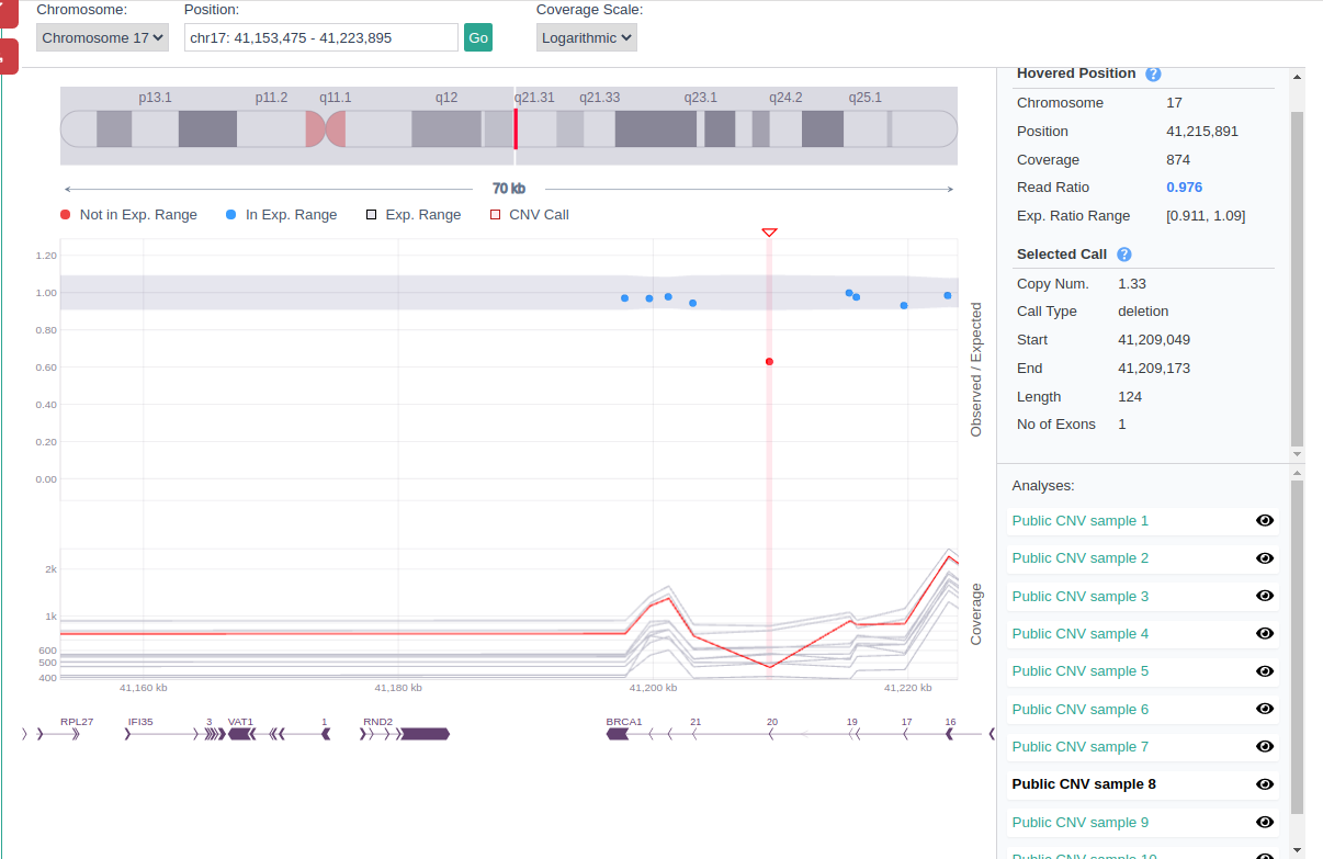 For example, you can use the CNV browser to visualize and contrast the test sample coverage of the region of the CNV call to other samples of the cohort. Genuine CNV calls usually show a clear, distinct pattern of coverage in the test sample that is not replicated in the reference samples.