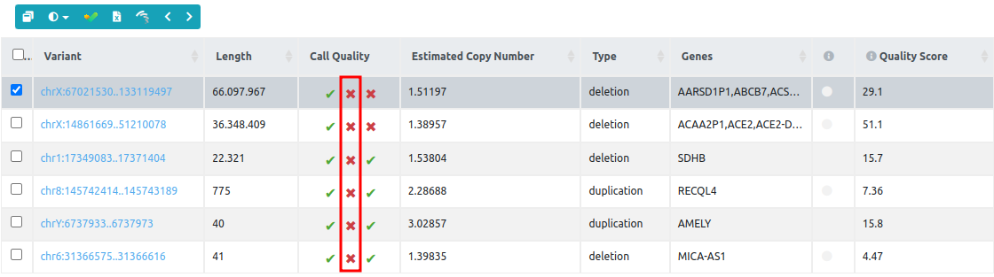 Each CNV call is assigned ticks and “X”s, so you can see at a glance whether each CNV has passed or failed the different quality checks. From left to right, these are: