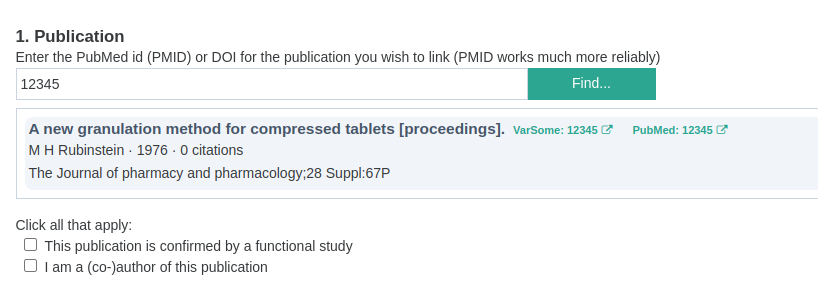 This will bring up the pop-up shown below. Enter the PubMed ID or DOI of the publication you want to link and click on “Find”. Please note that although DOIs are supported, PubMed IDs work more reliably.