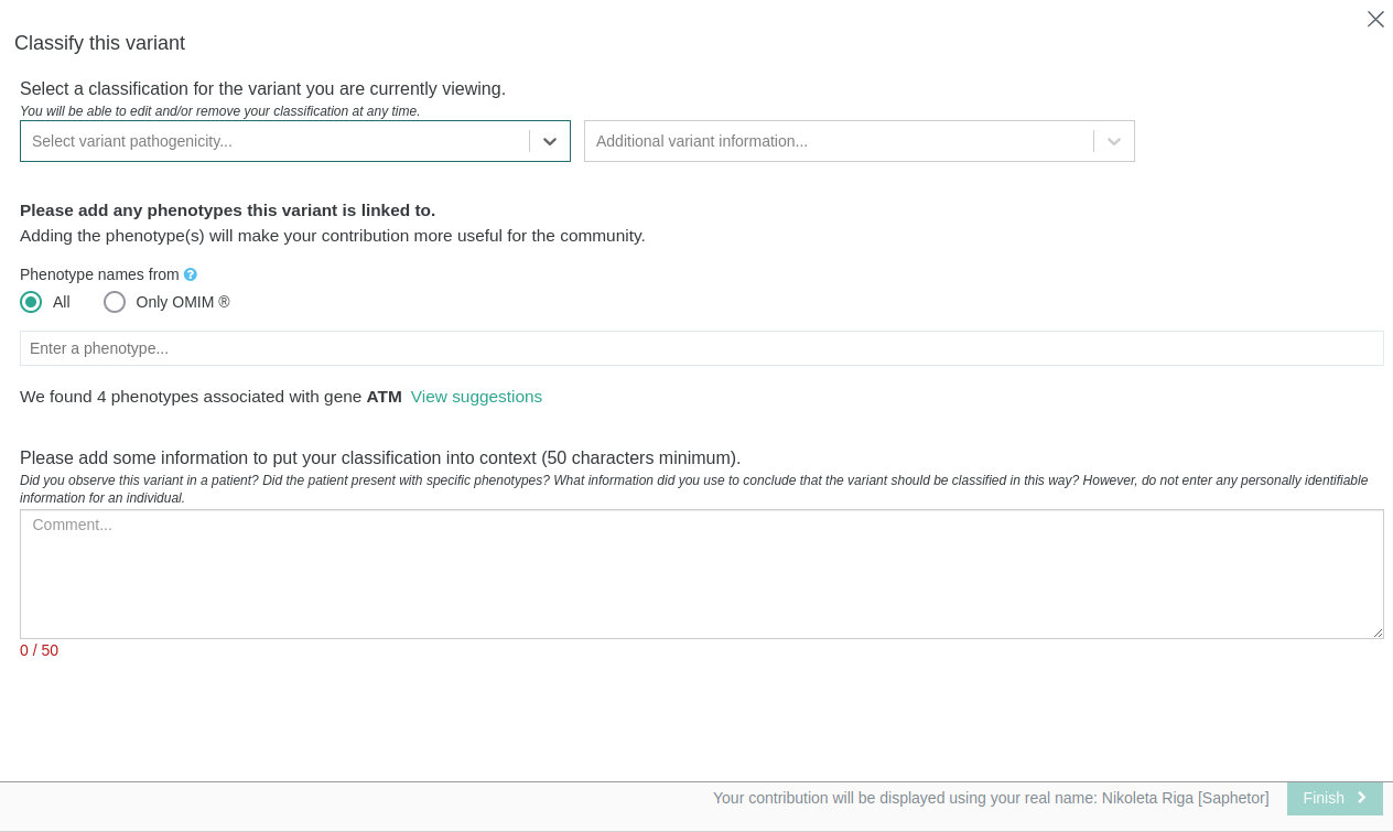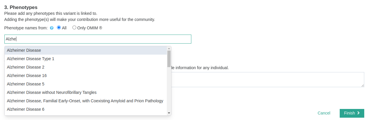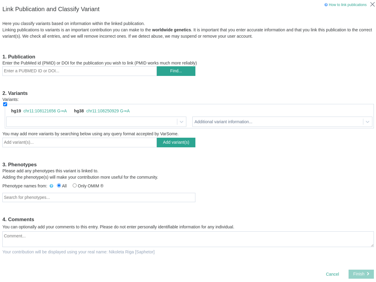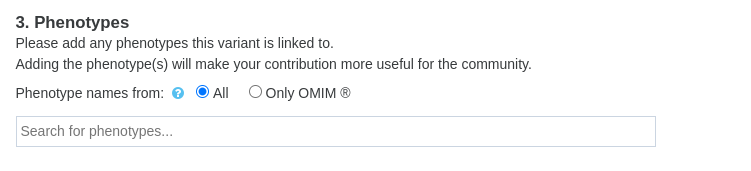 Before you finish, you are given the opportunity to add (if mentioned in the publication) related phenotypes (All or OMIM) linked to the variant: