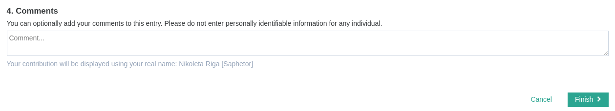Finally, you have the option to share a comment and/or end the process. A comment, although optional, is often very helpful since you can add any detail from the paper that will help other users understand the variant in context.