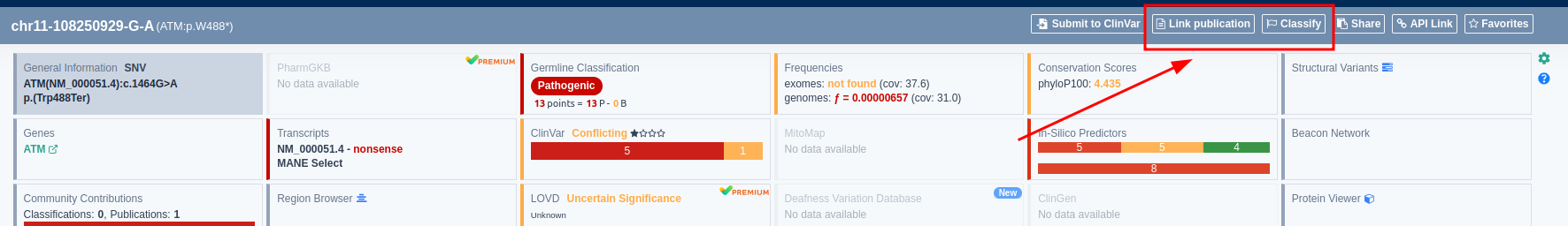 Also, you can link a publication or classify a variant by clicking on the options in the top page menu and then follow the instructions as described earlier: