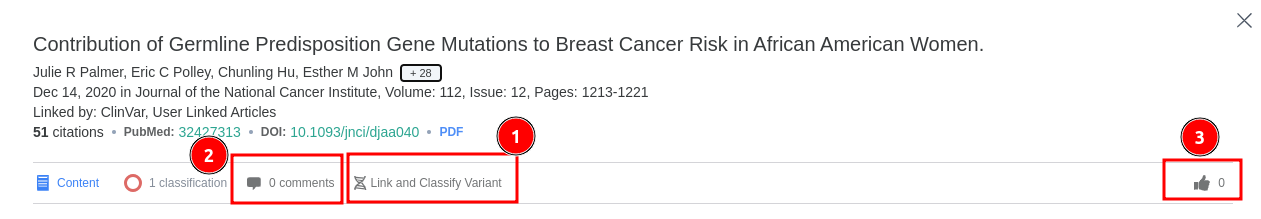 Now the publication you have linked to the variant will be added to the "Publications" section. Other users may want to connect with you and comment on your entry (1) link and classify the variant (2) or if they agree with your linked publication they can click on "Like" icon (3).
