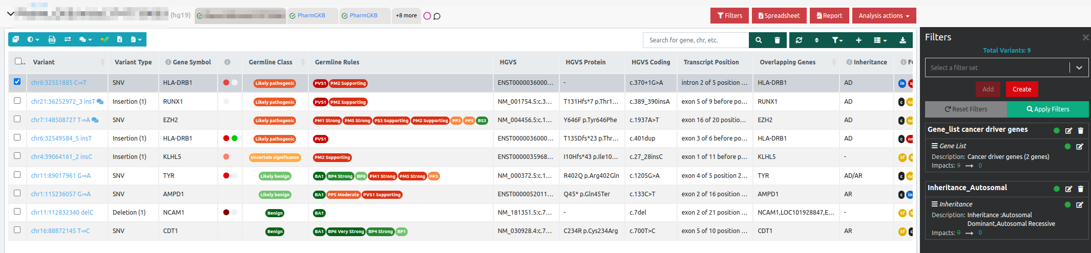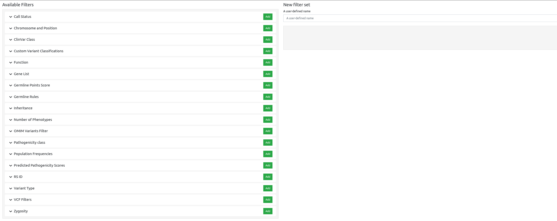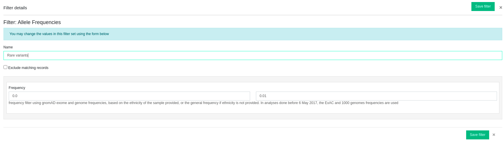 Care must be taken for shared filters because user-created filter sets are essentially composed of filter instances (e.g. a filter instance is the filtering of pathogenic variants), and filter instances can be turned on or off by the creator of the filter set. So, if the filter set is shared, other users who use this filter set may be able to apply it to their analyses, but may see that not all filter instances are enabled, and they can do nothing about it. If the original creator of the filter set chooses to, for example, disable a filter instance, then all other users who use that shared filter set will see changes in their results because of that. To avoid this you can duplicate the shared filter set as one of your own so that you have direct access to what is enabled or not.