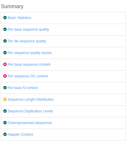 The different analyses (modules) performed for the FastQC report are summarized on the left of the screen, for each FASTQ file used for the analysis.