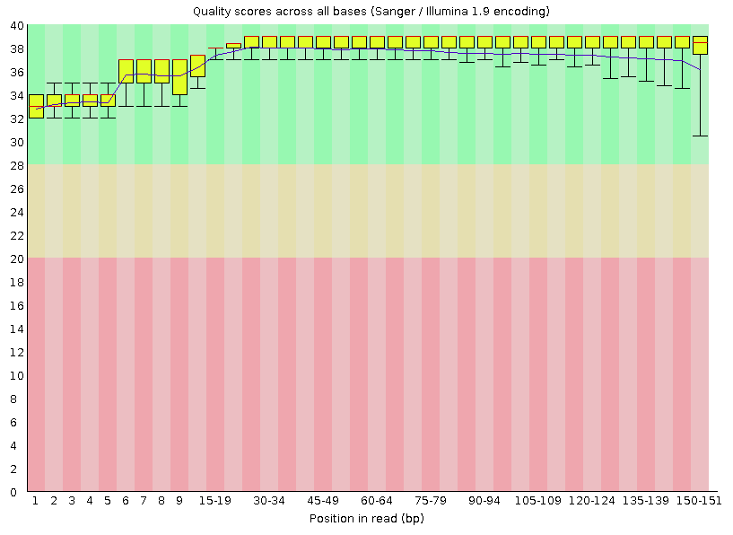 A box plot showing aggregated quality score (Phred score) statistics at each position along all reads in the file.