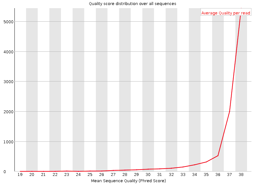 A plot of the total number of reads vs the average quality score (Phred score) over full length of that read.