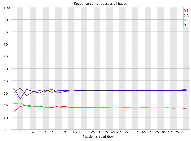 This plot reports the percent of bases called for each of the four nucleotides at each position across all reads in the file.