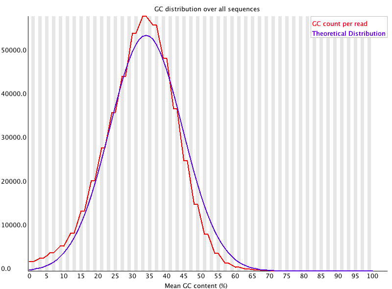 Plot of the number of reads vs. GC% per read. The displayed Theoretical Distribution assumes a uniform GC content for all reads.