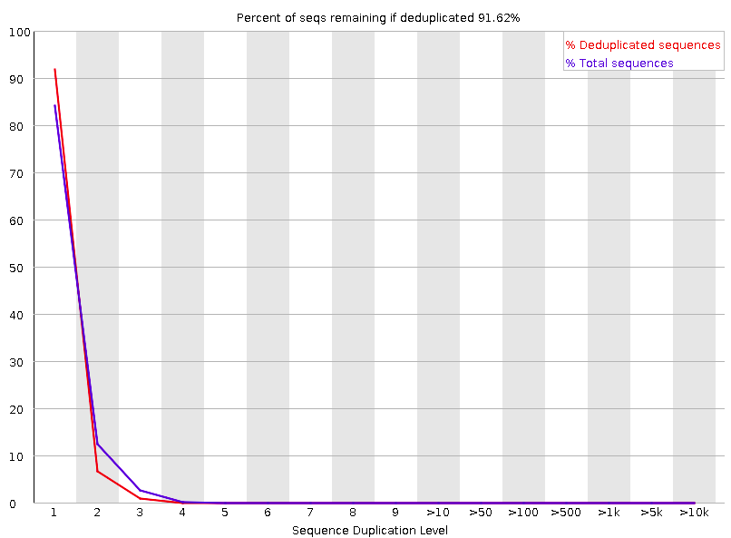 Percentage of reads of a given sequence in the file which are present a given number of times in the file.