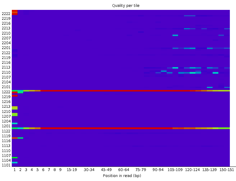The picture above shows an ideal case, where no quality loss is reported in any tile of the flow cell. On the contrary, in the picture below you can see that certain tiles show consistently poor quality. The colours are on a cold to hot scale, with cold colours being positions where the quality was at or above the average for that base in the run, and hotter colours indicate that a tile had worse qualities than other tiles for that base.