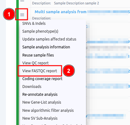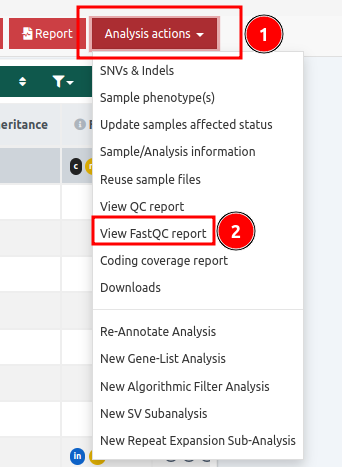 - to the Analyses page and select from the burger menu of the analysis you wish the "View FastQC Report" as shown below, or