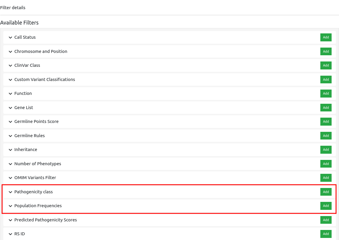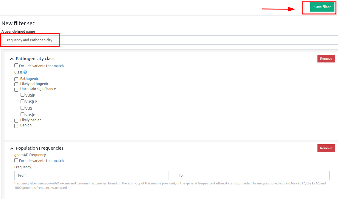 In order to filter for specific categories (e.g. Frequency and Pathogenicity), click on the filter icon and then “Create” - a pop-up screen will appear.