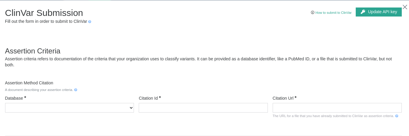 In order to submit to ClinVar you will have to provide evidence describing the criteria you use to classify variants. This is called "Assertion criteria" and you can provide it through a single citation, URL or a file name.
