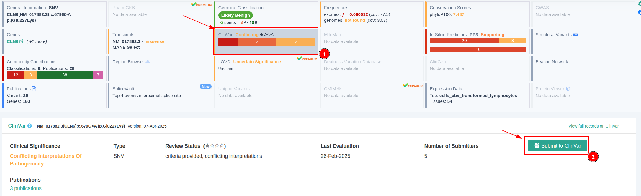 Search for the variant of interest on VarSome starting from one of the two options (1) and Click on the ‘’Submit to ClinVar’’ button (2) available on the Variant page: