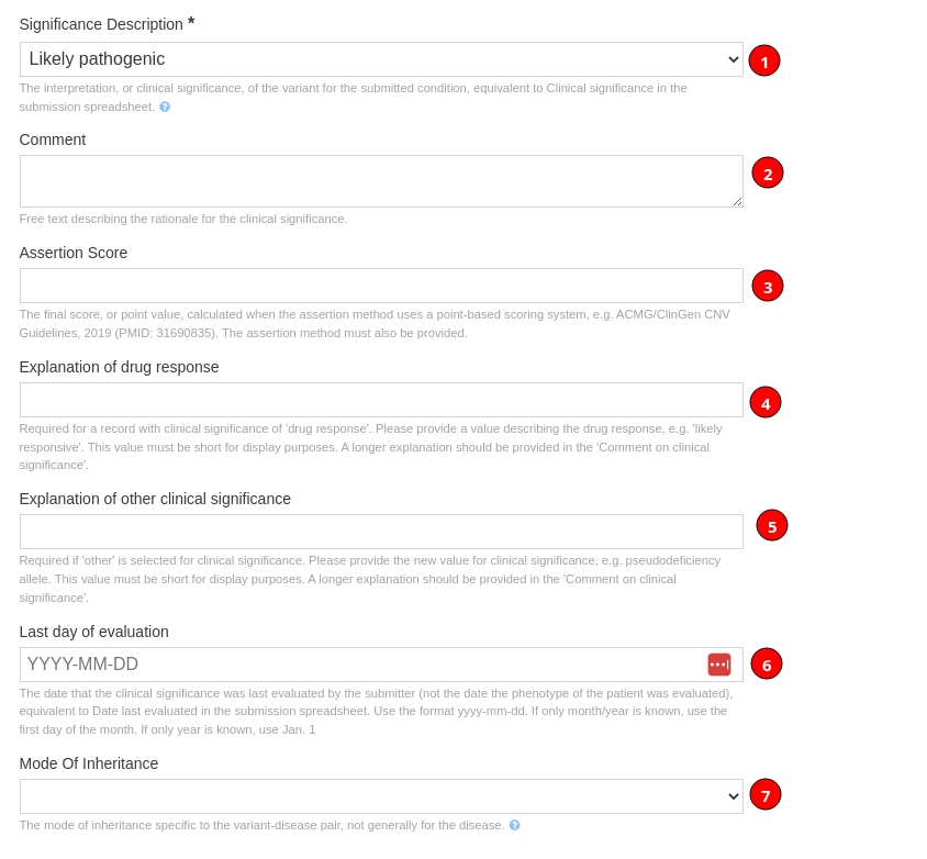Finally, you can provide the date when the clinical significance was last evaluated by the submitter (not the date the phenotype of the patient was evaluated), equivalent to date last evaluated in the submission spreadsheet. Please use the yyyy-mm-dd format. If only month/year is known, use the first day of the month. If only year is known, use XXXX-01-01. (6). Submitter should provide a value for clinical significance in the context of a submitted mode of inheritance (7).