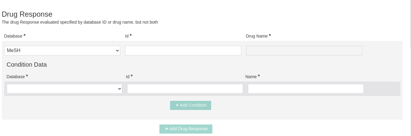 This section will be available only when "Drug Response" is selected as Significance Description in the Clinical Significance section. The condition for which the drug is used specified by database must be provided as either a database identifier (OMIM, MedGen, Orphanet, MeSH, HP, MONDO) or a name, but not both.