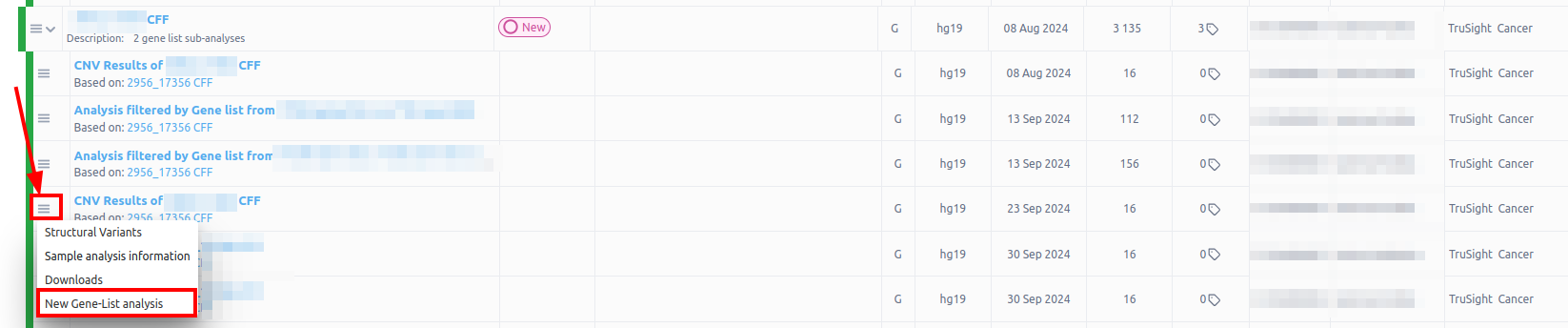 If a main analysis has more than one gene list, then the corresponding CNV component of this analysis will not contain any filtered results from these gene lists. However, if you want to launch a specific gene list to the CNV sub-analysis, you can do it by clicking on the Analysis actions, the option "Launch Gene-List analysis":