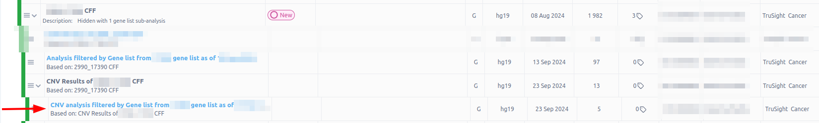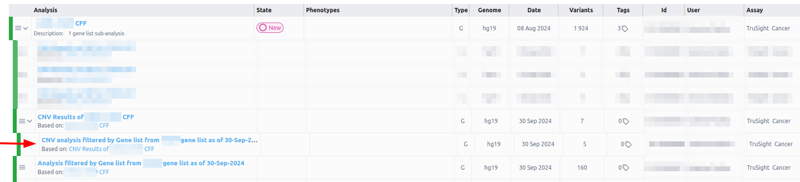 When a main analysis is launched and there is a gene list added afterwards, then the corresponding CNV analysis, deriving either from FASTQ or from a CNV VCF file, will automatically contain a sub-analysis with the Gene list's results for this CNV. The filtered CNV from gene list sub-analysis will appear as nested in the CNV analysis.
