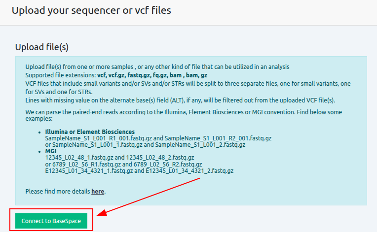 There are two options to connect your Illumina BaseSpace account depending on which BaseSpace Sequence Hub your data is allocated in (EU or US). After that, you will be automatically redirected to Illumina’s site in order to login to your account.