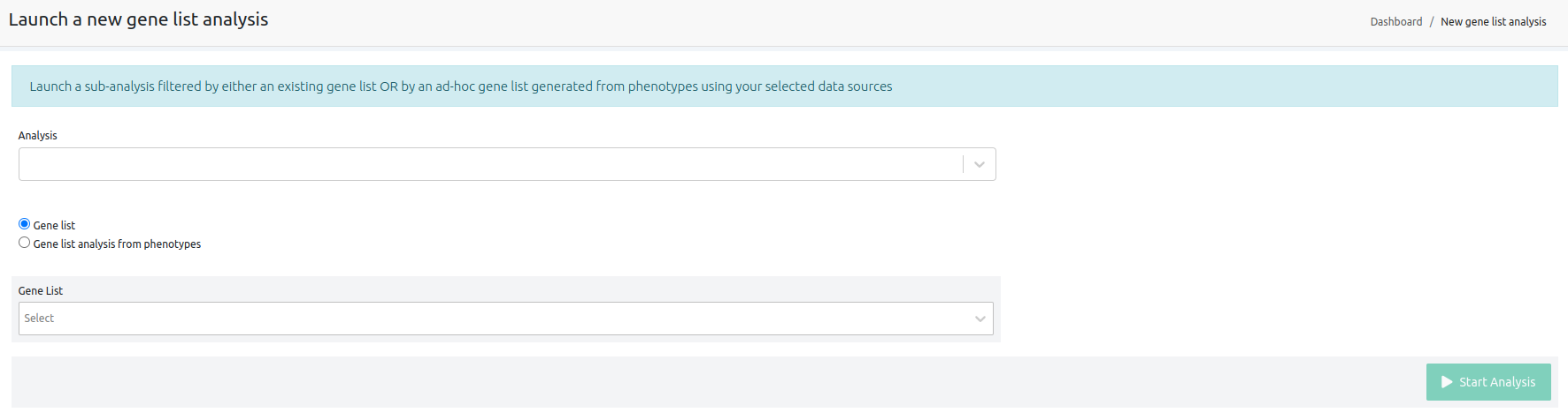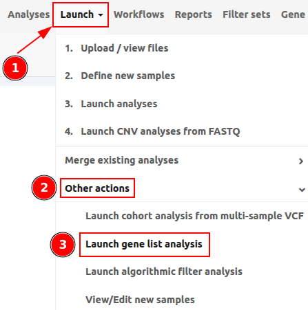 You can access Gene list analyses under "Launch" > "Other actions" > "Launch gene list analysis" as shown in the picture below.