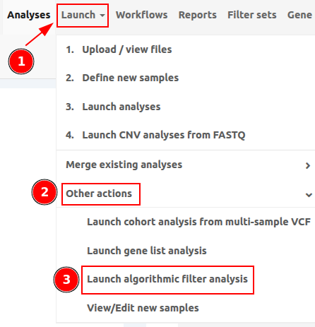 You can access the Algorithmic filter analyses under "Launch" > "Other actions" > "Launch algorithmic filter analysis" as shown in the picture below.