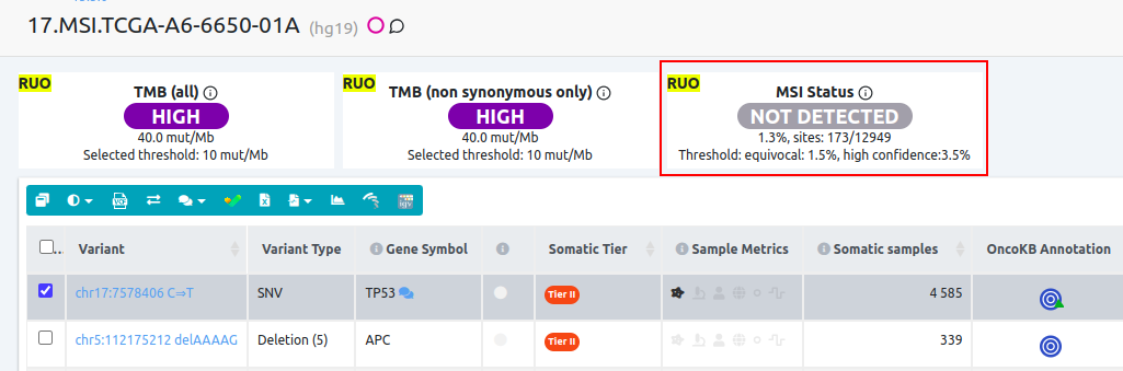 Any tumor-only somatic sample analyzed either with a WES sequencing assay (determined as assays targeting >= 31M bp that are not WGS) or an Agilent SureSelect Cancer CGP panel will get an MSI classification. In the results page of an analysis, the MSI status is visible above the Variant Table: