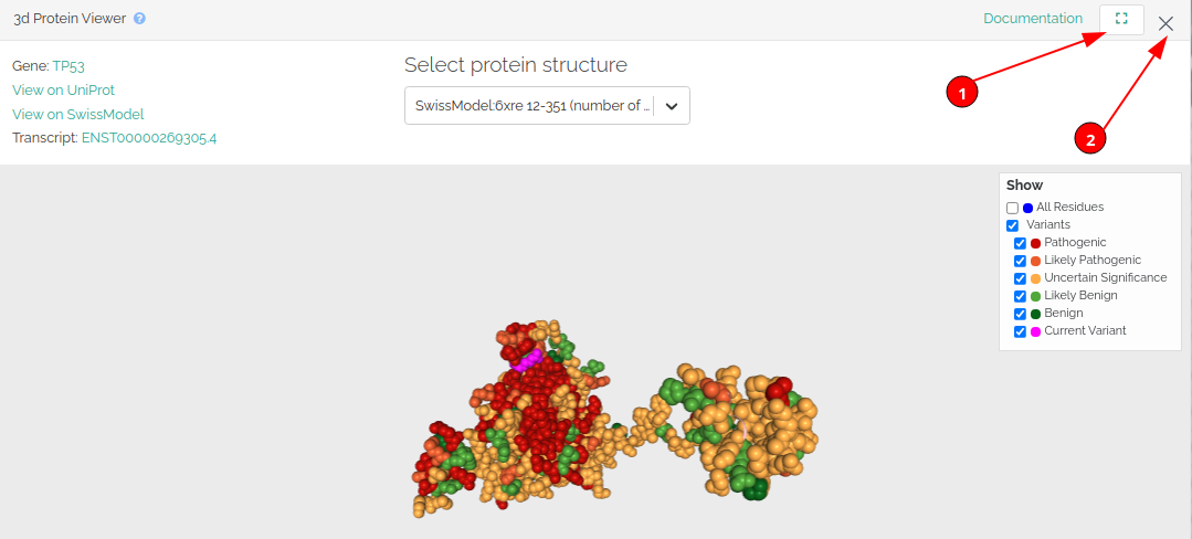 Go to the top right corner of the window to maximize the protein viewer page (1) or to close the window (2) and keep navigating through the VarSome website.
