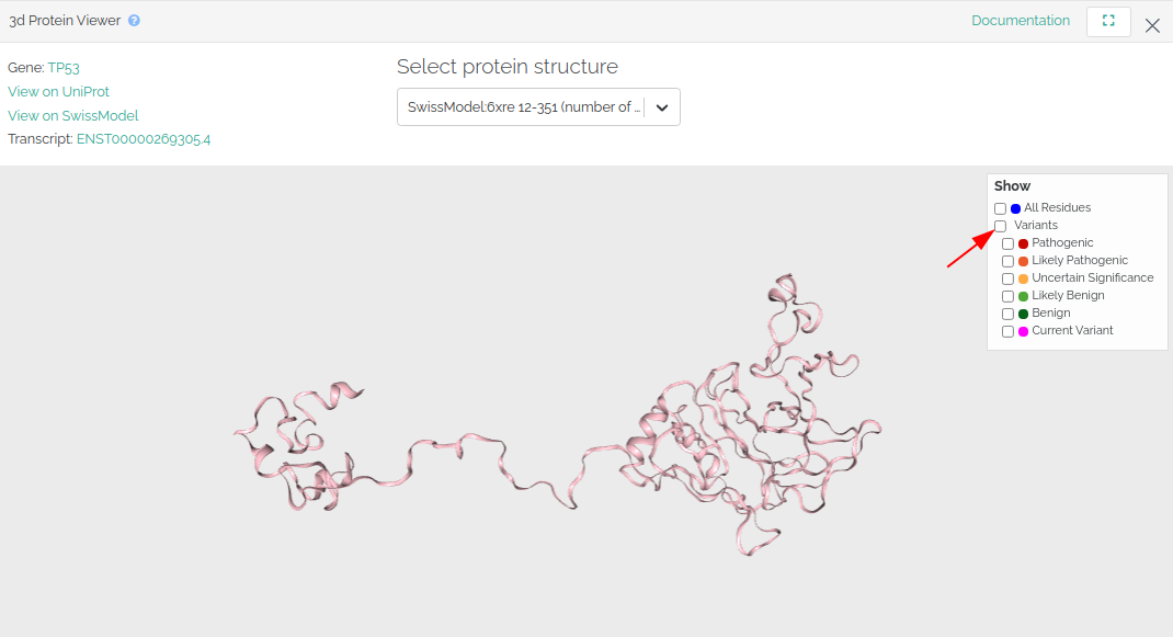 - Click on a residue of the protein structure to show a list of reported variants at that position below the protein structure.