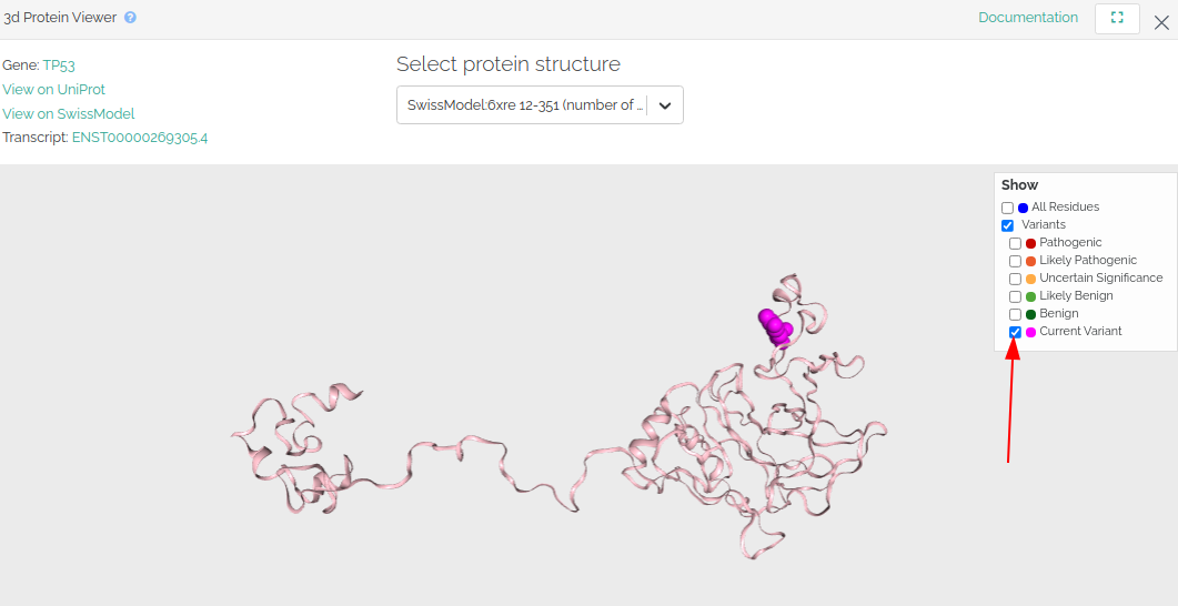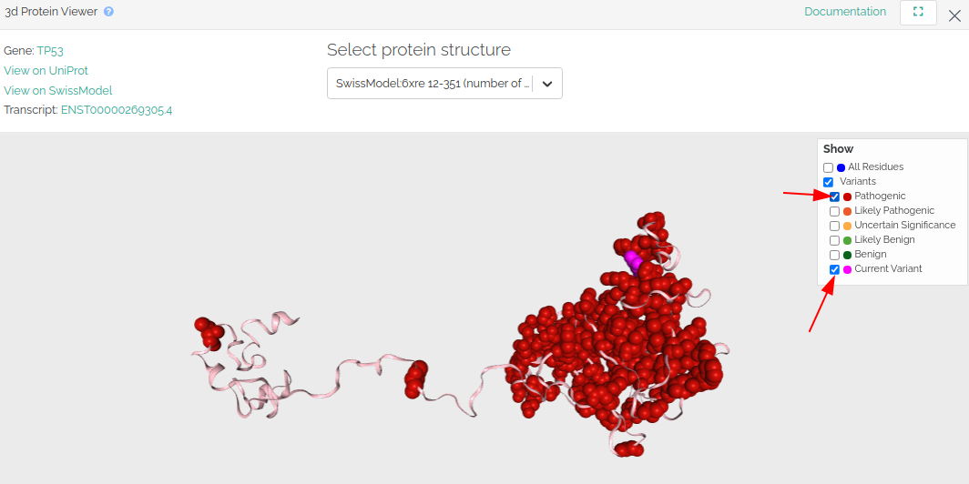 Variants reported from ClinVar, Uniprot and the VarSome Community are mapped onto the protein structure and are colored according to the Germline Variant Classification. Additionally, you will be able to see the variant of interest (the variant whose VarSome page you are currently visiting) in pink. You can decide which variants are shown in the "Show" menu on the top right corner.