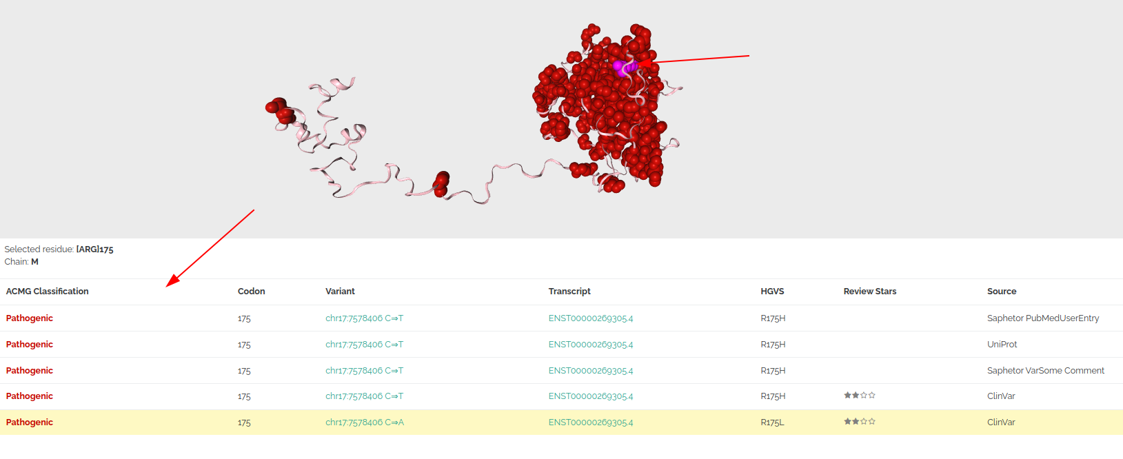 All the examples shown below were obtained using this variant: TP53:p.R175L.