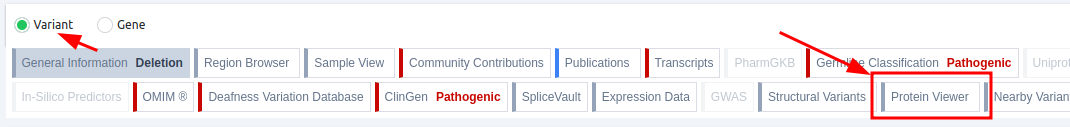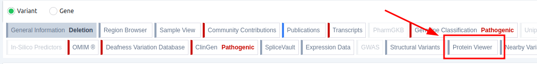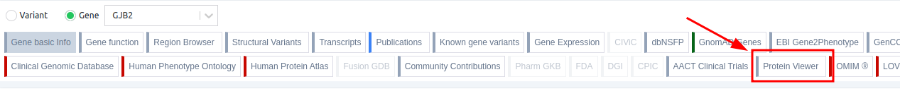 This tool is accessible from the “Gene/Variant basic information” section at the top of the window. Click on the “Protein Viewer” button to open a new window with the 3D Protein Viewer tool.