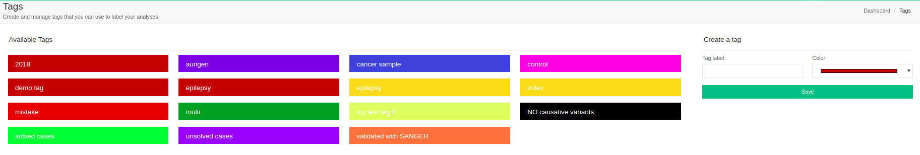 To create a new tag, enter a name in the "Tag label", choose a color and click on save.